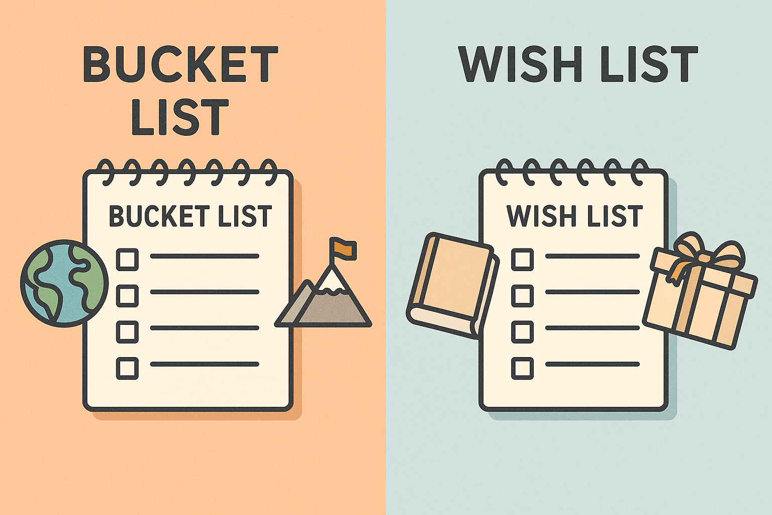 버킷리스트는 인생의 큰 의미와 연결된 목표 목록이고, 위시리스트는 현재의 소망과 소비 욕구를 반영한 목록입니다. 자신의 목표를 분류하고 실현 가능성을 계획할 때 두 개념을 잘 구분해 활용하면 좋습니다.