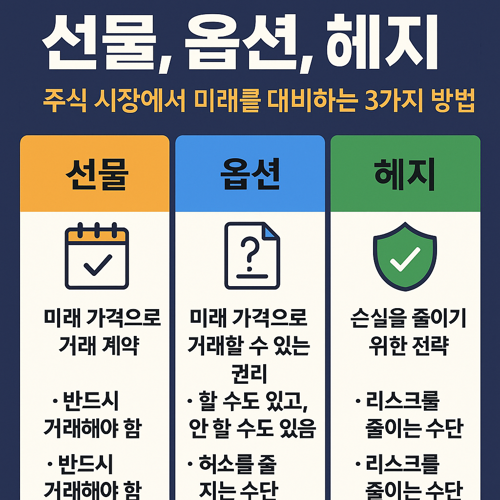 주식에는 우리가 자주 듣는 단어 외에도 한층 ‘고급’ 개념처럼 느껴지는 용어들이 있습니다. 바로 선물, 옵션, 헤지입니다.