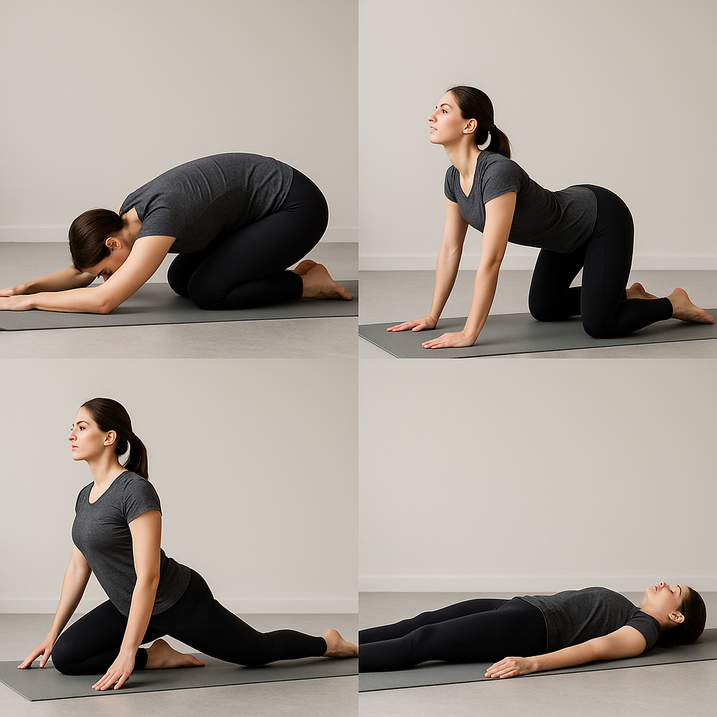 - 고양이-소 자세 (2분): 등과 목을 번갈아 스트레칭하며 척추를 유연하게 만들어보세요.