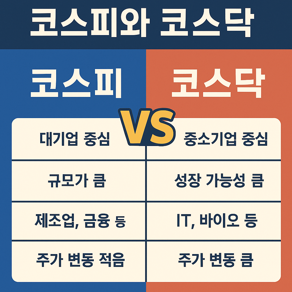 | 대표 업종 | 제조업, 금융, 중공업 등 | IT, 바이오, 게임, 콘텐츠 등 |